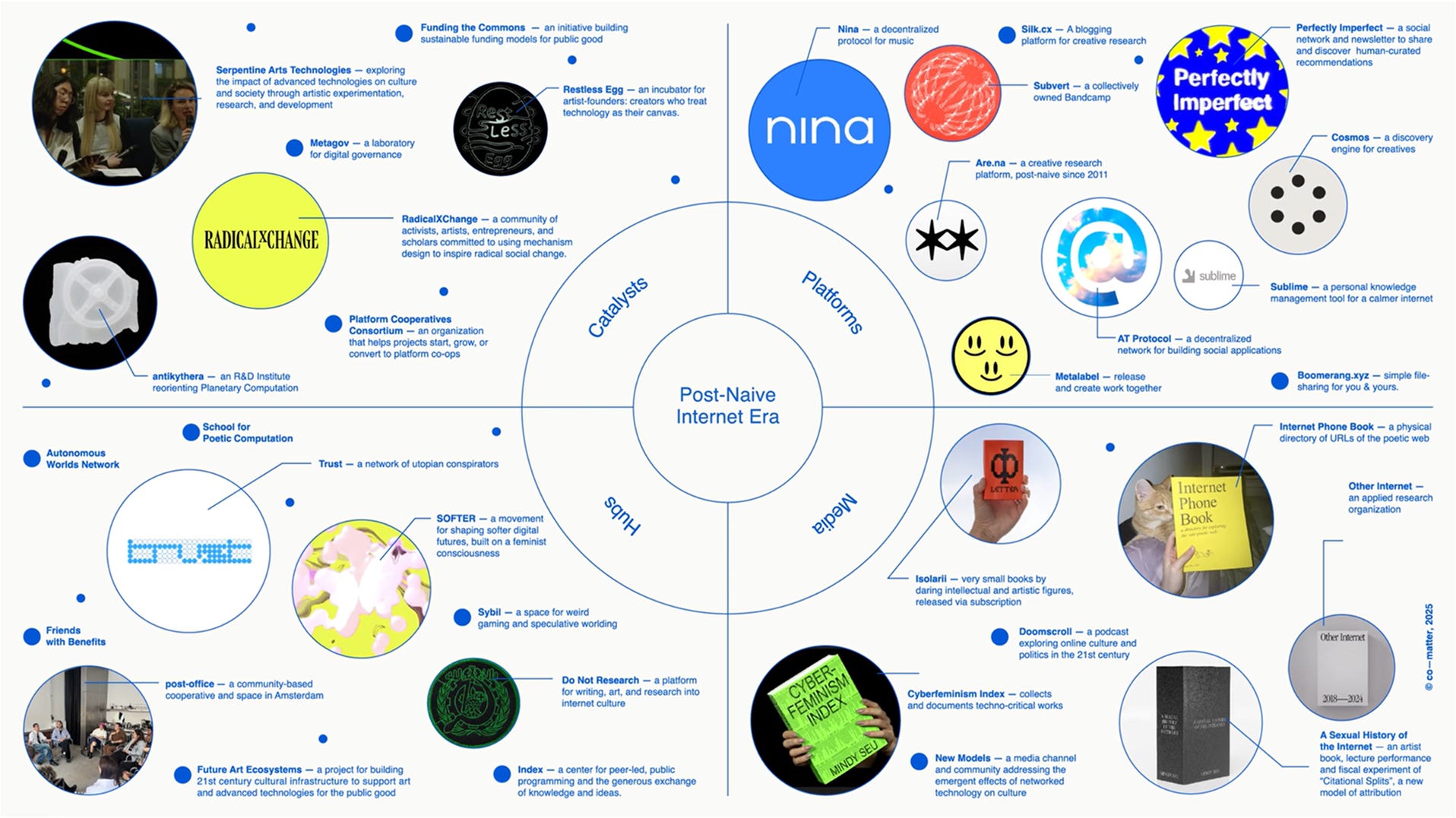 Mozilla的後天真宣言,蠻令人動容的。文中舉出Austin Robey創辦音樂平台Subvert的案例,是因為看到Bandcamp被Epic Games買走而下定決心。這些行動者不再是為了所有人而努力,而是專注替特定族群建立數位基礎設施。文中還附有「後天真網路時代地圖」,可以看到「老朋友」RadicalxChange和Serpentine Arts Technologies,朋友拿來整理書單的Are.na,還有我個人初次聽說的創意平台Metalabel,在柏林運作的非營利網絡Trust.support,以及匯集各路Poetic Web的實體黃頁Internet Phone Book等,值得收藏。